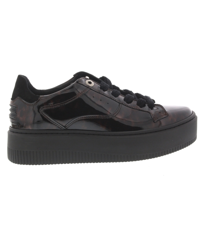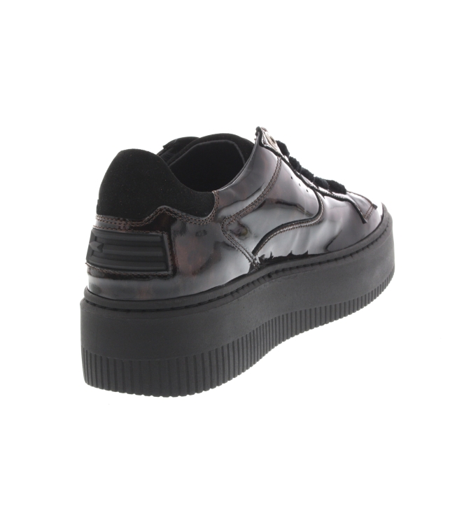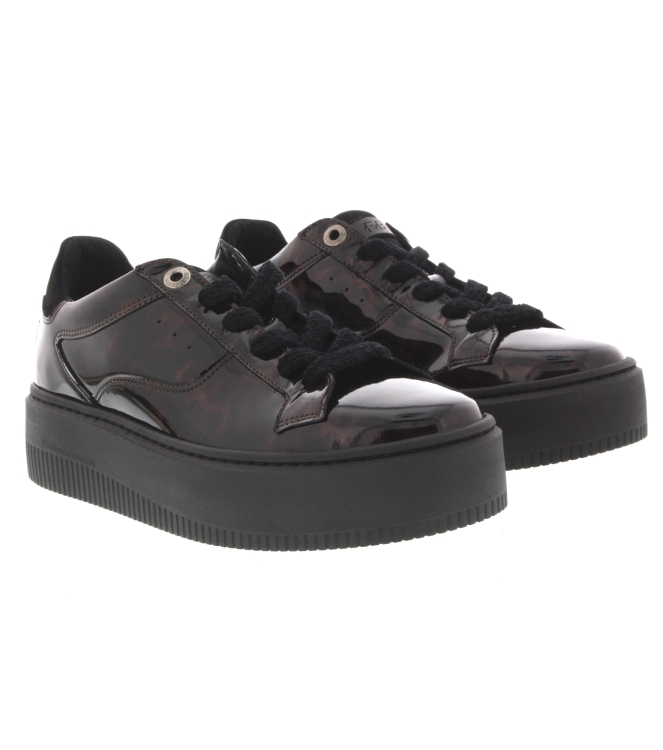 Floris van Bommel sneaker voor dames, artikel Mouri 01.04 in het donkerbruin lakleer. Uniek is de subtiele print in het lakleer. De binnenzijde is volledig leder gemaakt, en de sneaker beschikt over een uitneembaar voetbed. De pasvorm valt breder door de G wijdte.