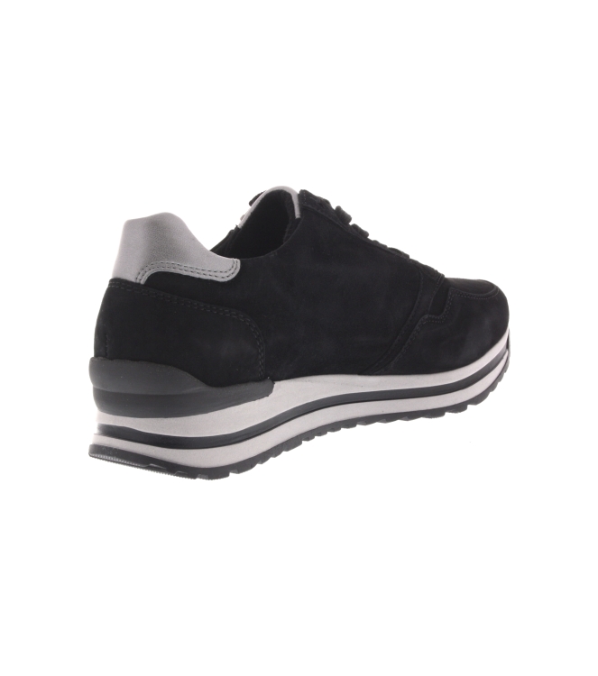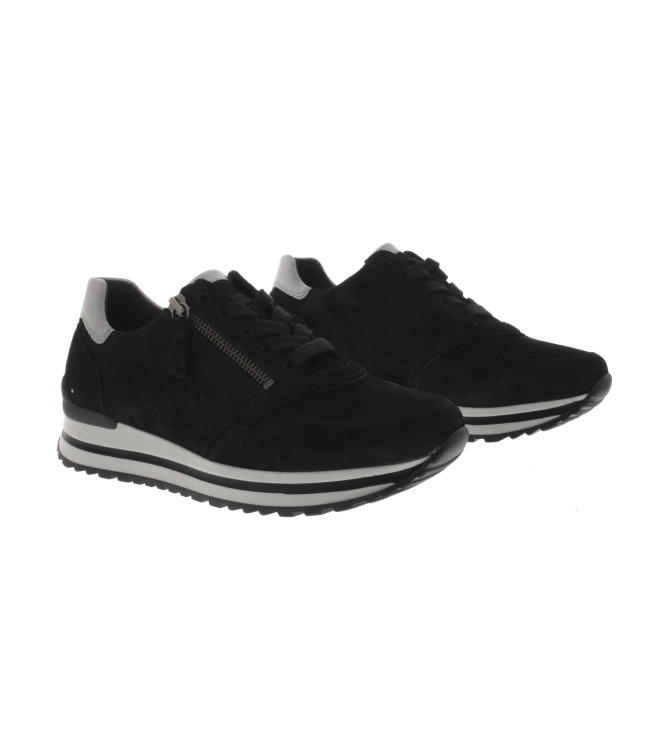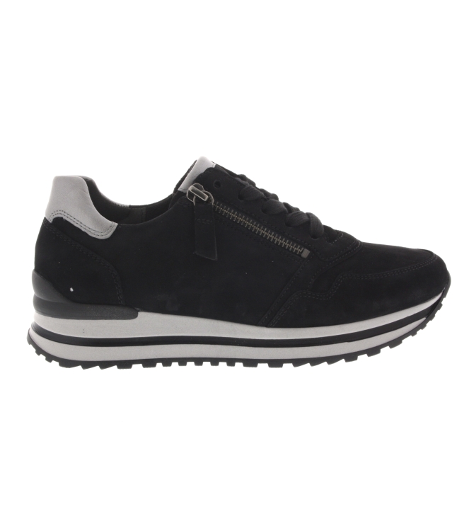 Gabor sneaker voor dames, artikel 36.528.67 in het zwart nubuck leer. Beschikbaar met uitneembaar voetbed. De pasvorm valt breed door de H wijdte