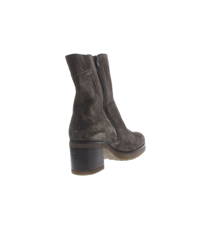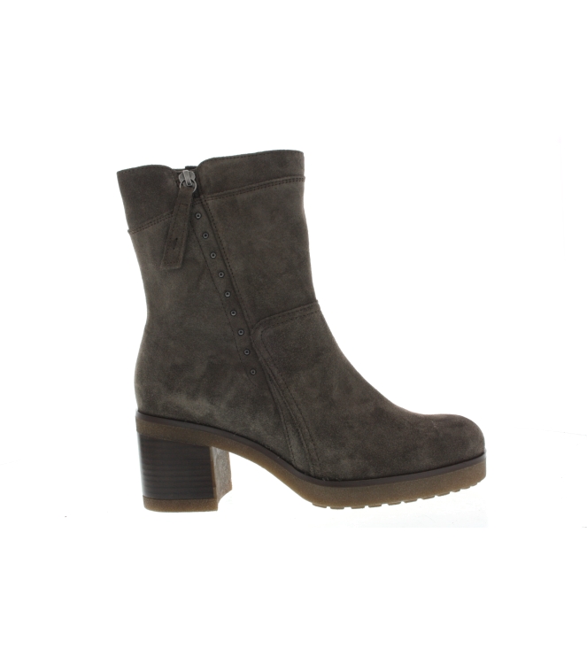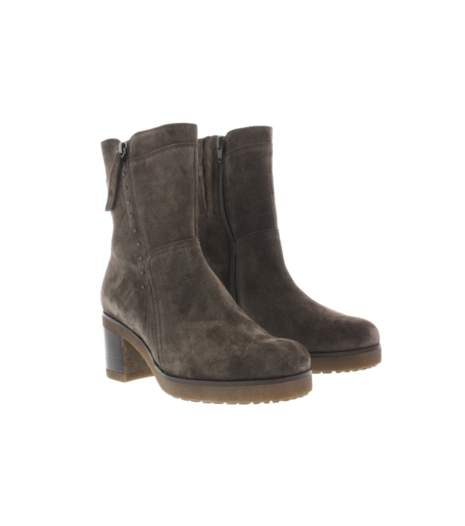 Gabor enkellaars voor dames, artikel 52.853.30 in het taupe nubuck leer. De hakhoogte bedraagt 5 cm en de laars heeft tevens een uitneembaar voetbed. De pasvorm valt iets breder door de G wijdte.