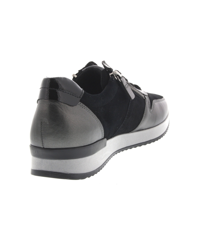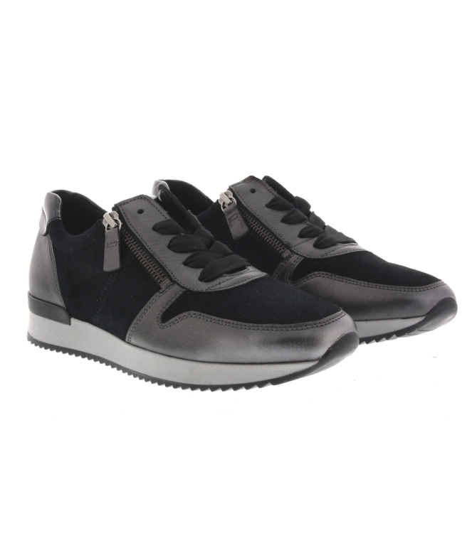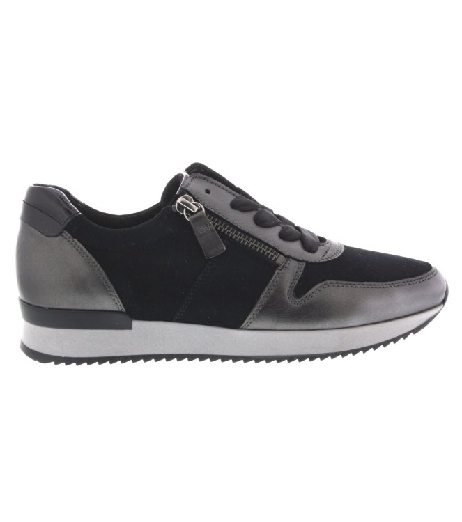 Gabor sneaker voor dames, artikel 53.420.69 welke gemaakt is in het zwart en oud zilver leer. Beschikbaar met uitneembaar voetbed. De pasvorm valt normaal.