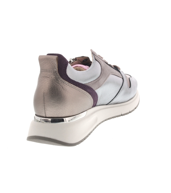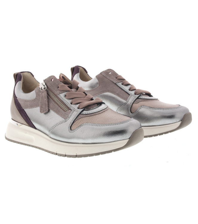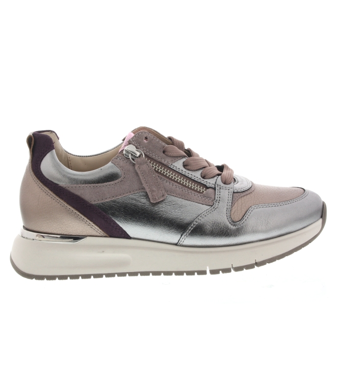 Gabor sneaker voor dames, artikel 56.446.63 in het zilver multi leer. Beschikbaar met uitneembaar voetbed. De pasvorm valt breed door de H wijdte.