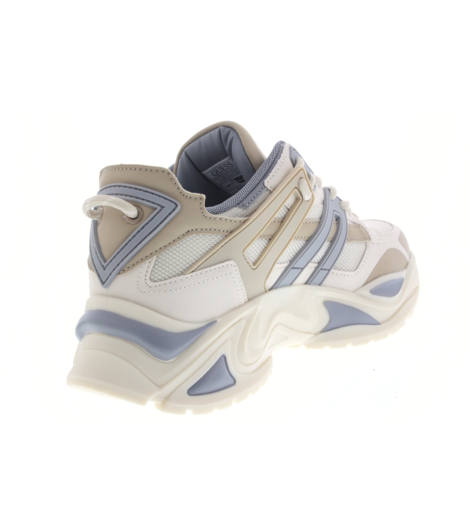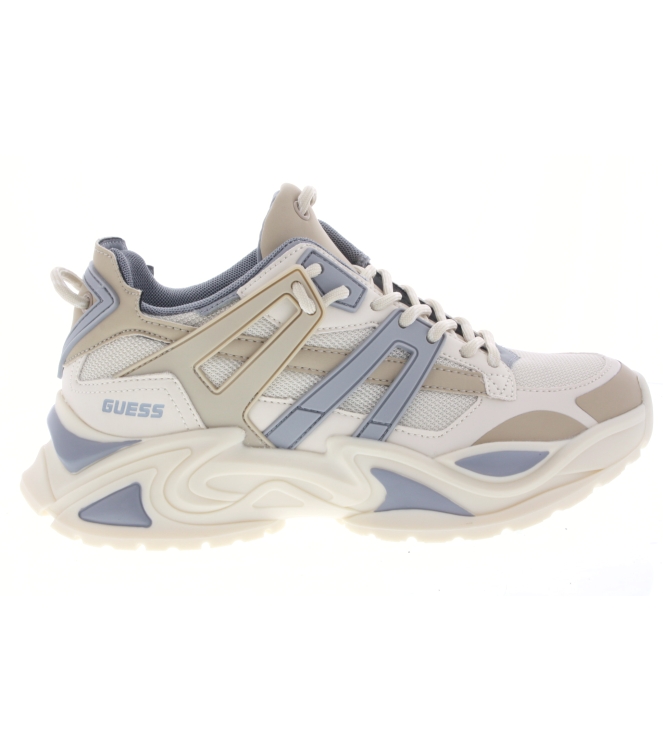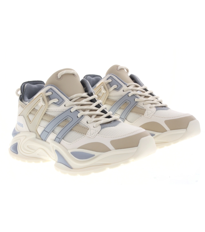 Guess sneaker voor dames, artikel Belluna in het nude en grijs leatherlook. Pluspunt is het lichte gewicht van de schoen. De pasvorm valt normaal.