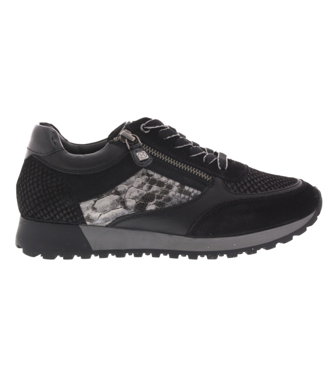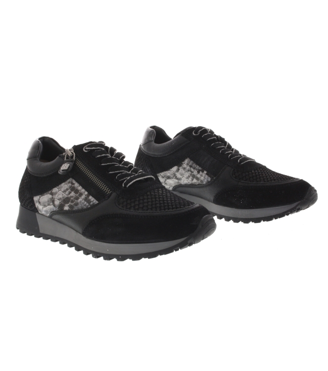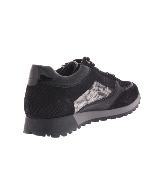Helioform sneaker voor dames, artikel 293.003 in het zwart leer. Fraai detail is de subtiele reptielen print in het leer. De sneaker beschikt tevens over een uitneembaar voetbed. De pasvorm valt breed door de H wijdte
