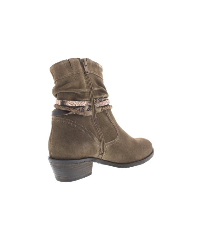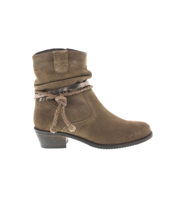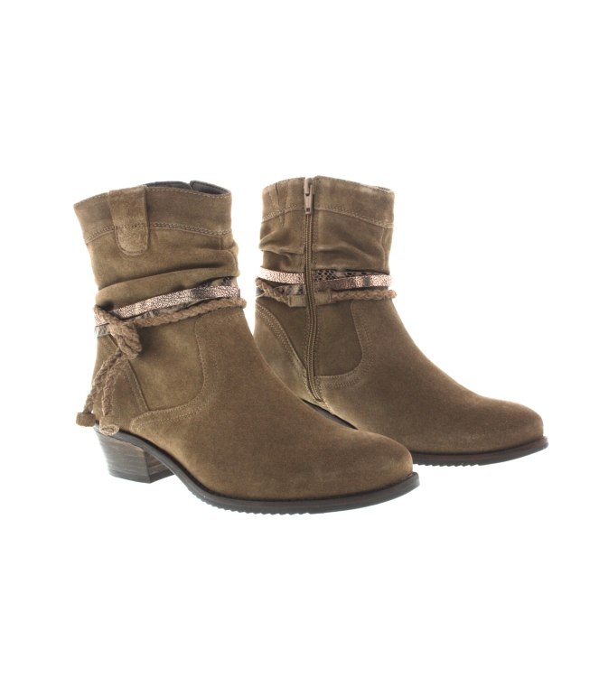 Helioform enkellaarsjes voor dames, artikel 584.002 in het zand suede leer. Beschikbaar met uitneembaar voetbed. Fijn klein blokhakje met een hoogte van 3 cm. De pasvorm valt breed door de H wijdte.