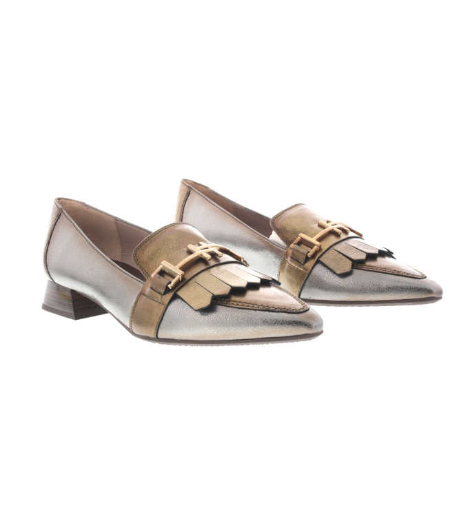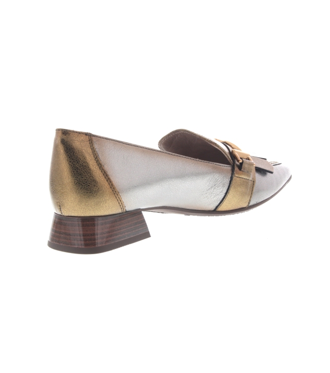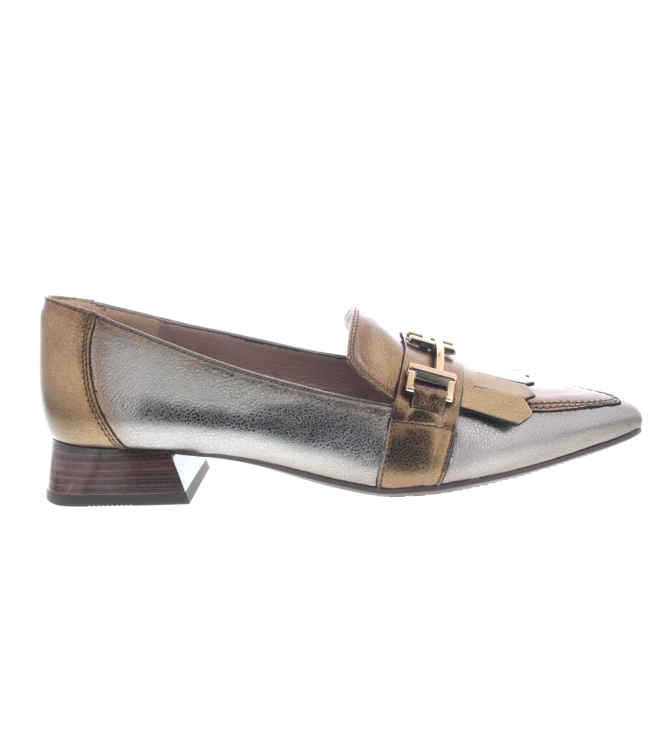 Hispanitas pump voor dames, artikel Dali CHI243573 in het brons multi leer. Pluspunt is het soepele leer en het kleine blokhakje van 2,5 cm. De pasvorm valt normaal.