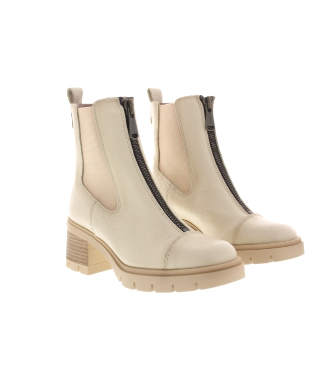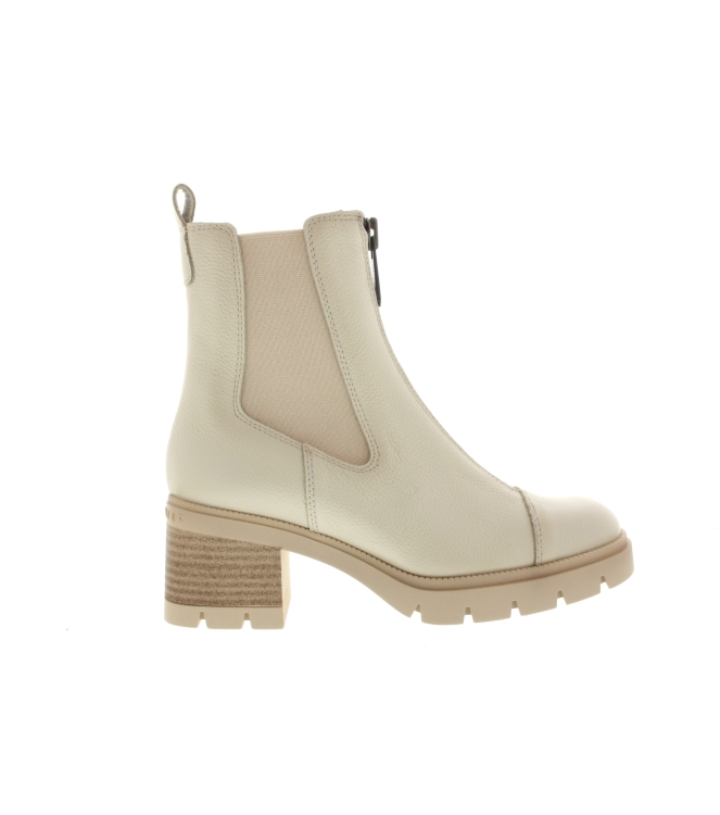 Hispanitas enkellaars voor dames, artikel Everest HI243636 in het beige leer. Fraai detail is de stoere rits aan de voorzijde. De blokhak heeft een hoogte van 4 cm. De pasvorm valt normaal.
