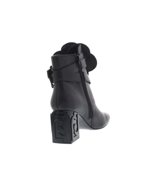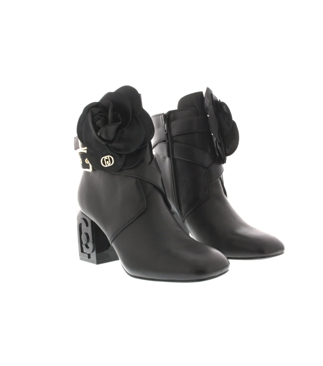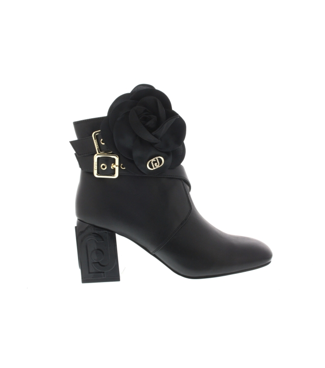 Liu Jo enkellaarsjes voor dames, artikel Sara 04 in het zwart leer. Fraai detail is de sierlijke bloem. De hakhoogte bedraagt 8 cm. De pasvorm valt normaal.