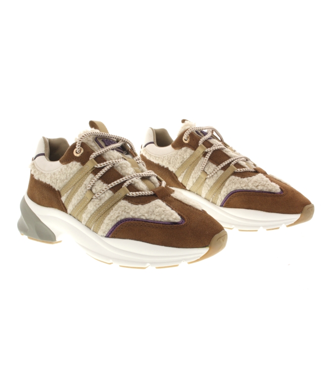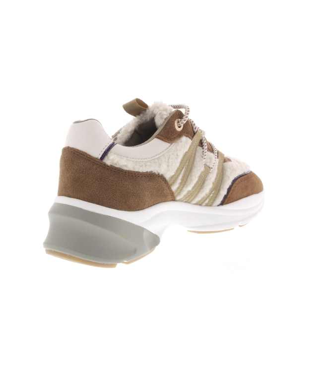 Mexx sneaker voor dames, artikel Moana in het bruin leatherlook. Fraai detail is de teddy bewerking op de sneaker. De pasvorm valt normaal.