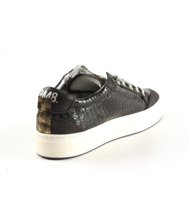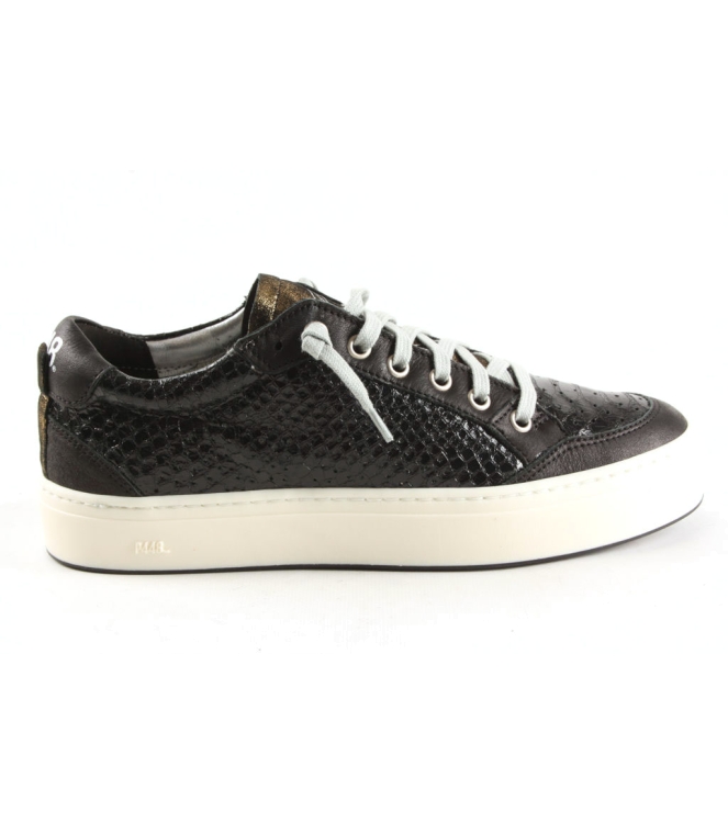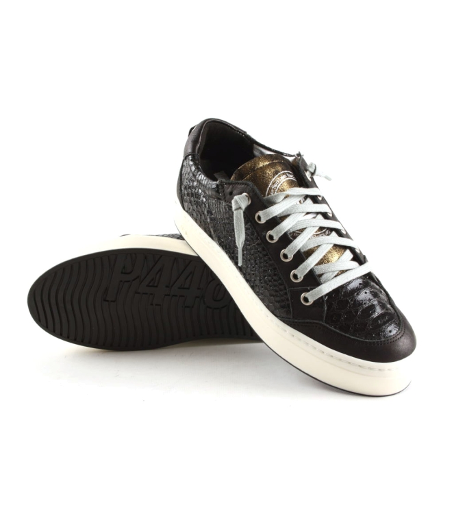 P448 dames sneaker artikel Lovelow in het zwart leer. Uniek is de subtiele croco bewerking in het leer. P448 staat voor Italiaans design en comfort. De pasvorm valt normaal
