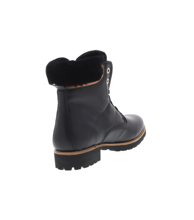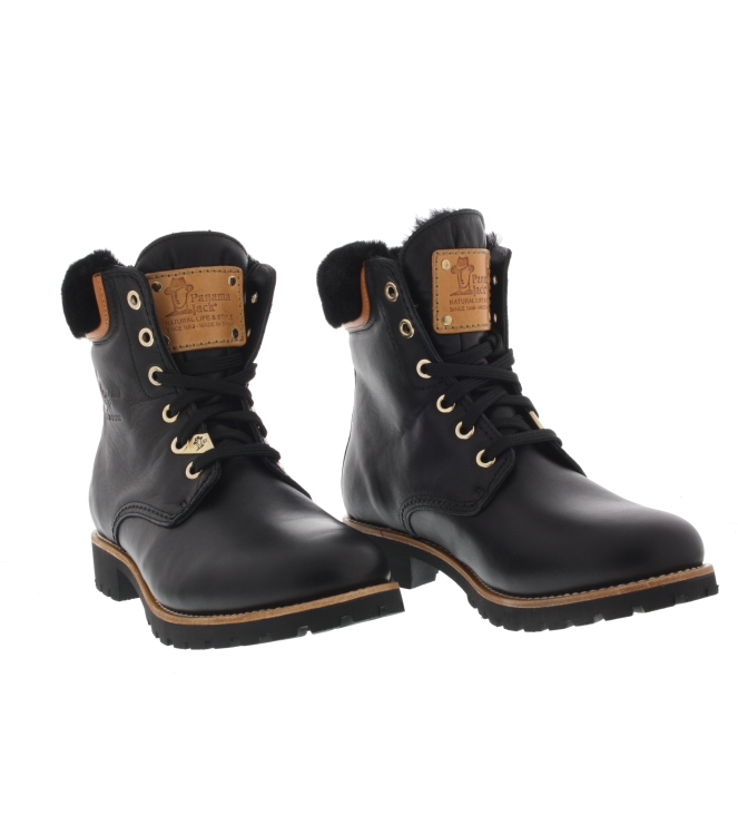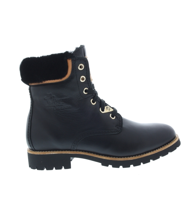 Panama Jack dames veterboot artikel Panama 03 Igloo in het zwart leer. De schoen is met schapenvacht gevoerd wat ideaal is voor deze koudere tijden. De pasvorm vat normaal.
