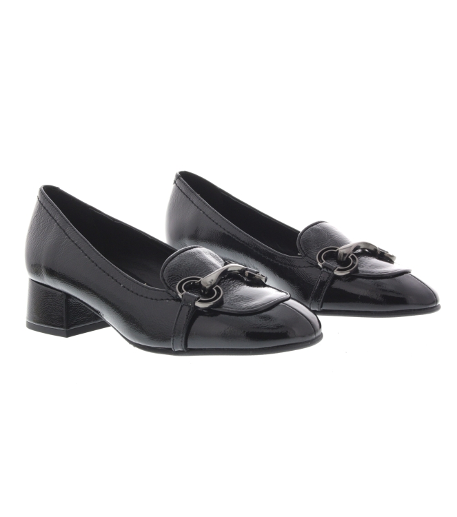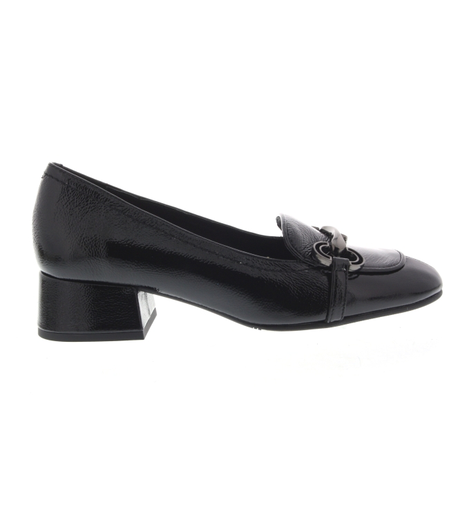 Tijdloze pump van het damesmerk Pedro Miralles. Artikel 28130 is gemaakt in het zwart lakleer. De pump is voorzien van een fijne blokhak a 3 cm hoog. De pasvorm valt normaal.