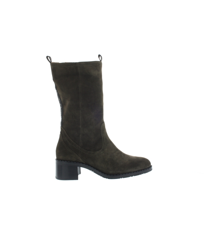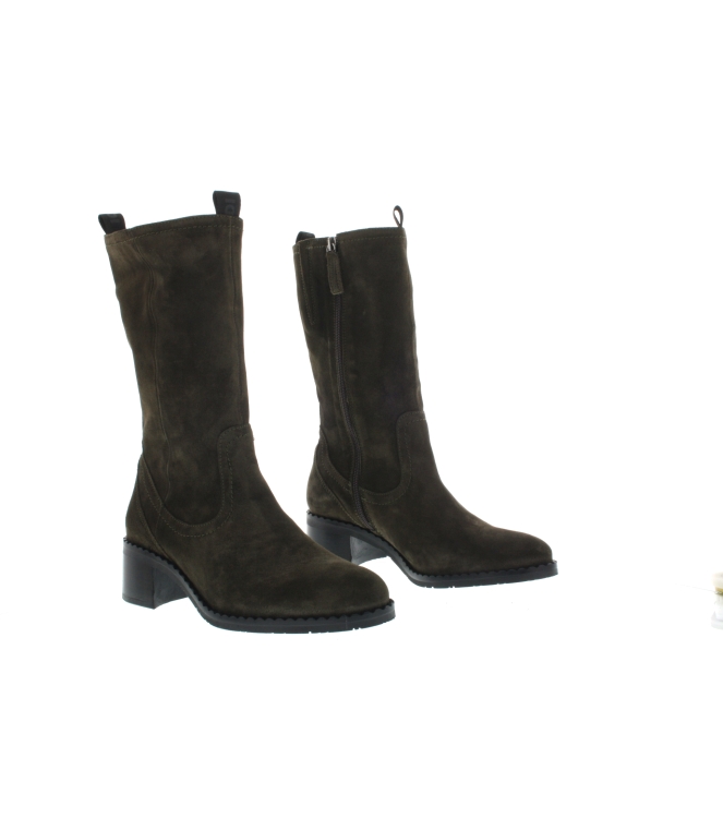 Piedi Nudi laars voor dames, artikel 2679-05.01PN in het bruin/groen nubuck leer. De maakwijze is zowel binnen als buiten volledig leder. Beschikbaar met uitneembaar voetbed. De pasvorm valt breed door de H wijdte