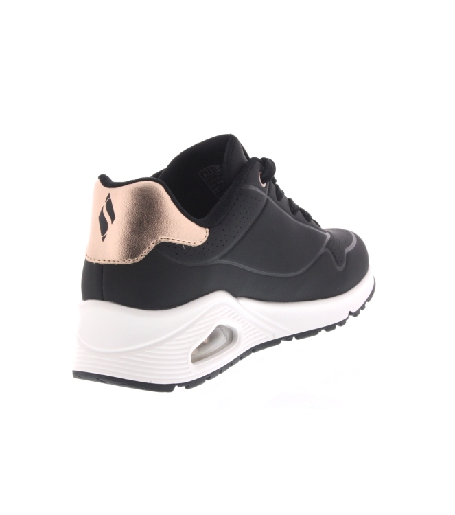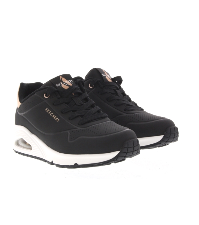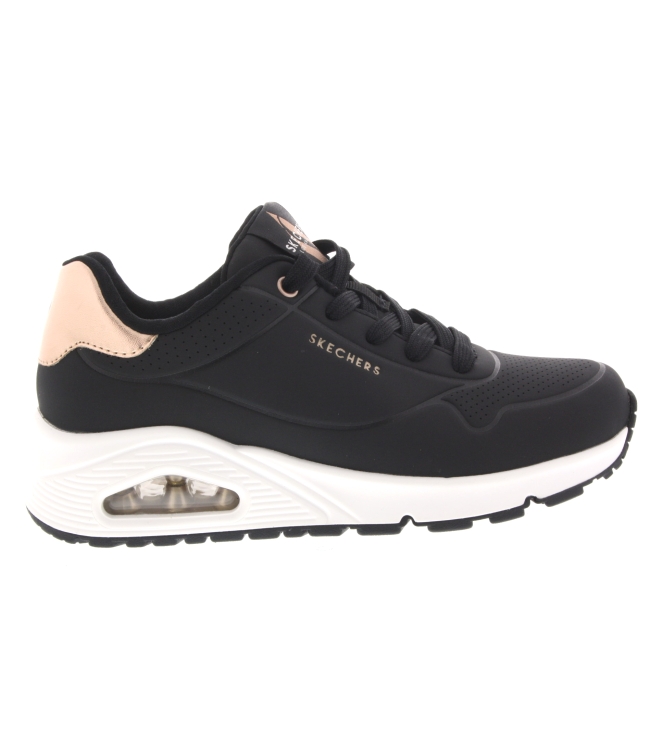 Skechers sneaker voor dames, artikel Uno 177094 Golden Air in het zwart leatherlook. Fraai detail is AIR zool wat voor een sportief uiterlijk zorgt en een fijne demping. De pasvorm valt normaal.