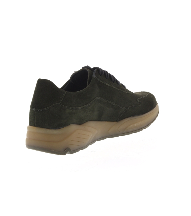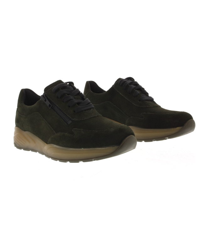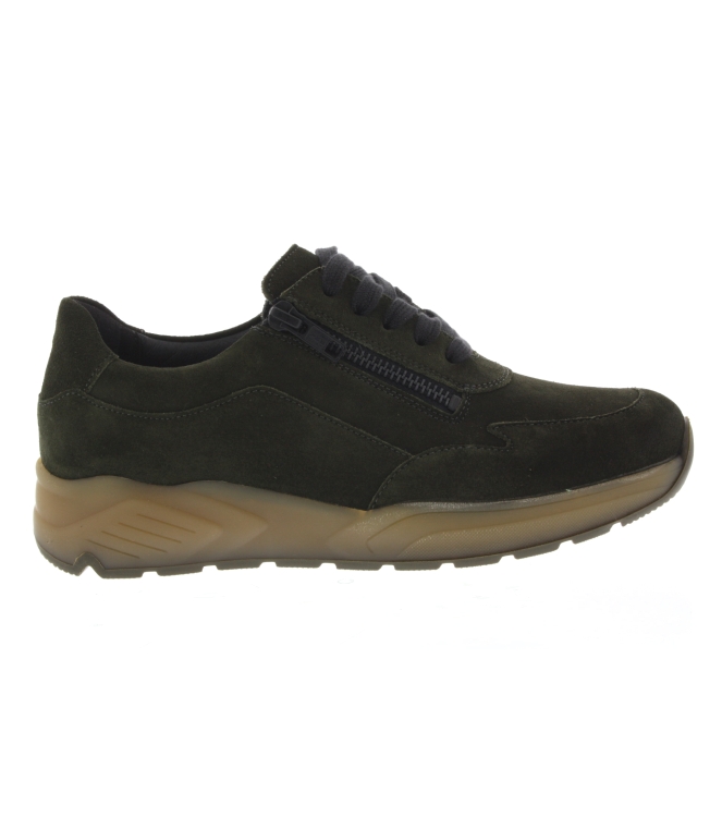 Solidus sneaker voor dames, artikel Hills 53002 in het donkergroen nubuck leer. Handig detail is de functionele ritssluiting. Solidus damesschoenen zijn altijd voorzien van een uitneembaar voetbed. De pasvorm valt breed door de H wijdte