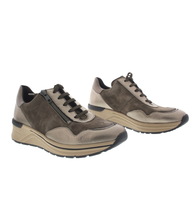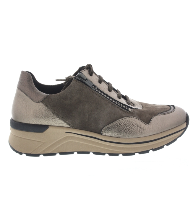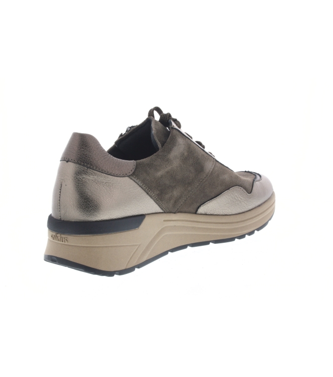 Solidus sneaker voor dames, artikel Karma 59071in het taupe combi leer. De sneaker beschikt over een uitneembaar voetbed. De pasvorm valt breed door de K wijdte.