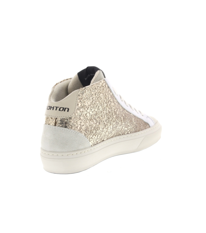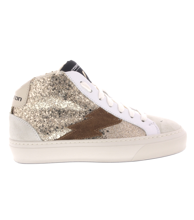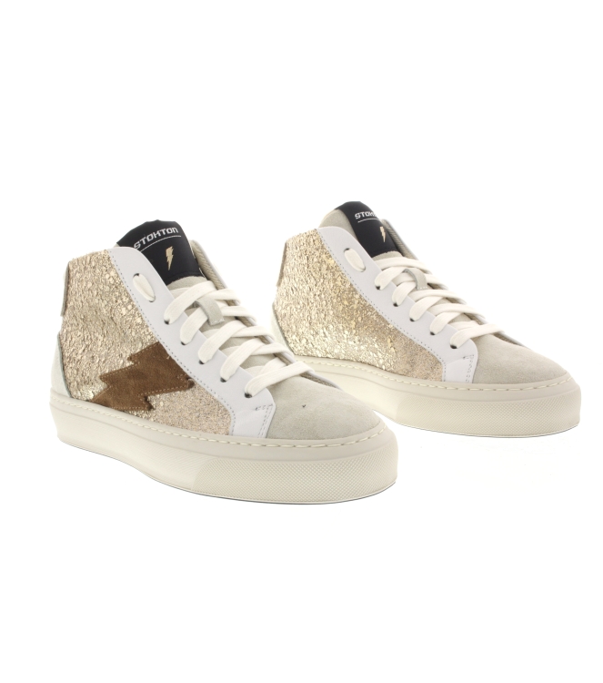 Stokton Mid sneaker, artikel Bolt-D in het goud combi leer. Fraai detail is de bliksemschacht. Beschikbaar met uitneembaar voetbed. De binnenzijde is van zacht nylon. De pasvorm valt normaal.