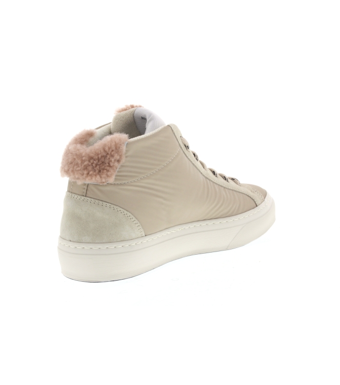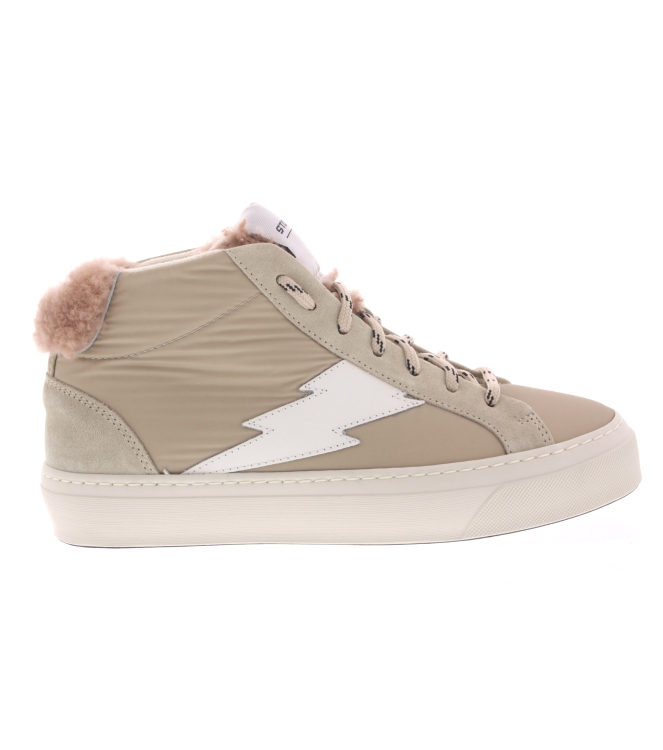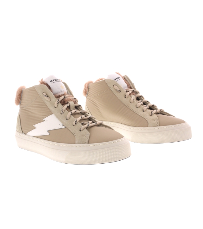 Stokton Mid sneaker, artikel Flare-D in het beige. Fraai detail is de bliksemschacht. Beschikbaar met uitneembaar voetbed. De binnenzijde is van zacht nylon. De pasvorm valt normaal.