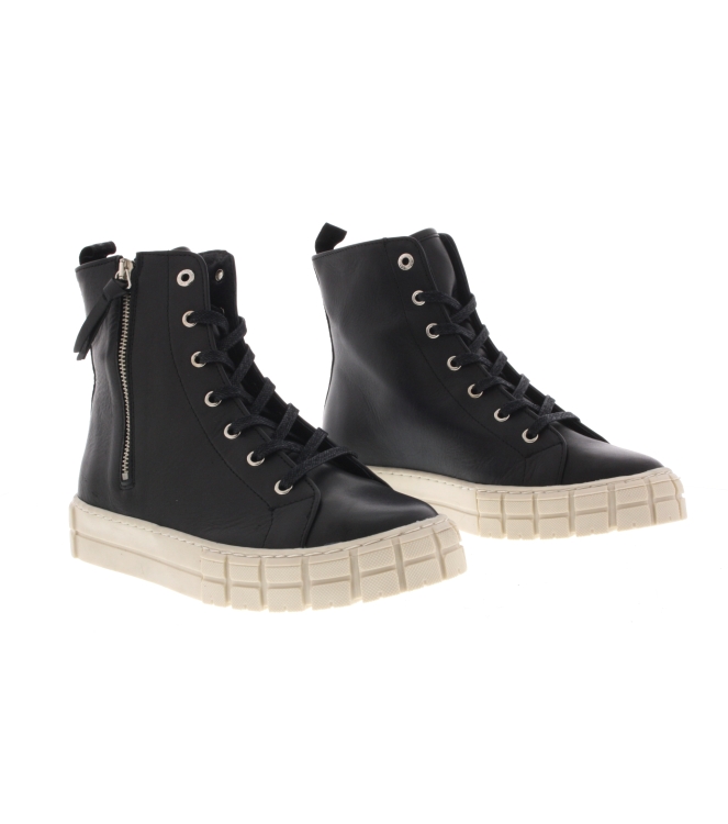 Tango dames mid sneaker artikel Tessa 2-C in het zwart leer. De maakwijze van Tango schoenen is volledig leder en deze veterschoen beschikt over een uitneembaar voetbed. Fraai detail is de chunky zool. De pasvorm valt normaal.