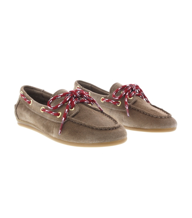 Mocassins Kimana - Taupe Suede Leer met Rode Veters | ToralMaak kennis met dé trend van deze zomer: Shima mocassins van het Spaanse merk Toral in luxe taupe suede leer, voorzien van een opvallend en speels detail - rode veters. Deze combinatie van natuurlijke, zachte tinten met een subtiel kleuraccent maakt dit model een echte must-have voor jouw lente- en zomercollectie.Het hoogwaardige suede voelt zijdezacht aan en vormt zich comfortabel naar je voet, terwijl de neutrale taupe kleur een veelzijdige basis biedt die moeiteloos past bij al jouw outfits. Het verrassende detail van de rode veters geeft een frisse, moderne touch en maakt van deze mocassin een echte eyecatcher zonder te overheersen.De Kimana is perfect voor iedereen die houdt van veelzijdige styling: draag ze casual onder een lichte jeans of chino, combineer ze met een luchtige zomerjurk of geef een chique touch aan een elegante pantalon. Dankzij het comfortabele draagcomfort en de stijlvolle afwerking zijn deze mocassins ideaal voor lange lentedagen, zonnige terrasmomenten en zomerse uitstapjes.Trend van deze zomer: natuurlijke materialen en subtiele kleurcontrasten. Met de Toral Kimana in taupe suede leer met rode veters ben je verzekerd van een fashionable, veelzijdige en onderscheidende look.