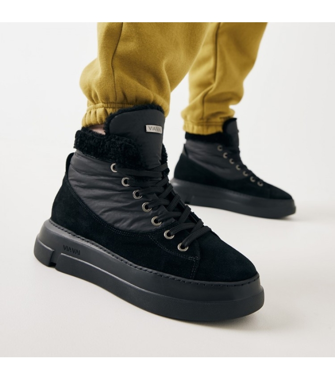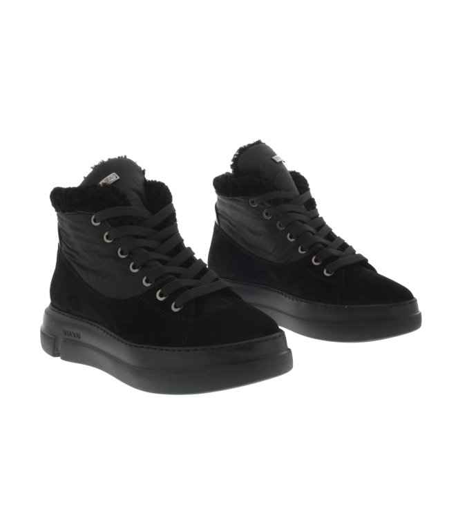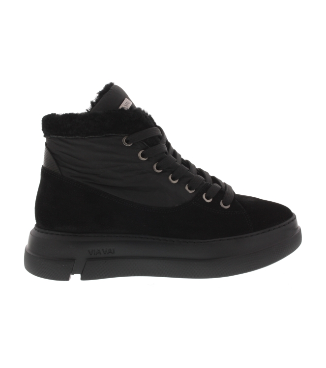 Bij deze hoge sneaker va Via Vai denk je gelijk aan 3 dingen, cozy gevoel, chunky look and feel. Gemaakt in het zwart leer. In combinatie met schapenvacht enkel aan de bovenzijde van de sneaker. De pasvorm valt normaal bij de Blue Ted.