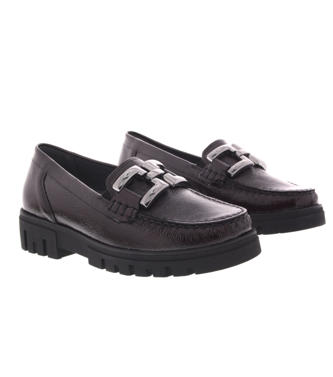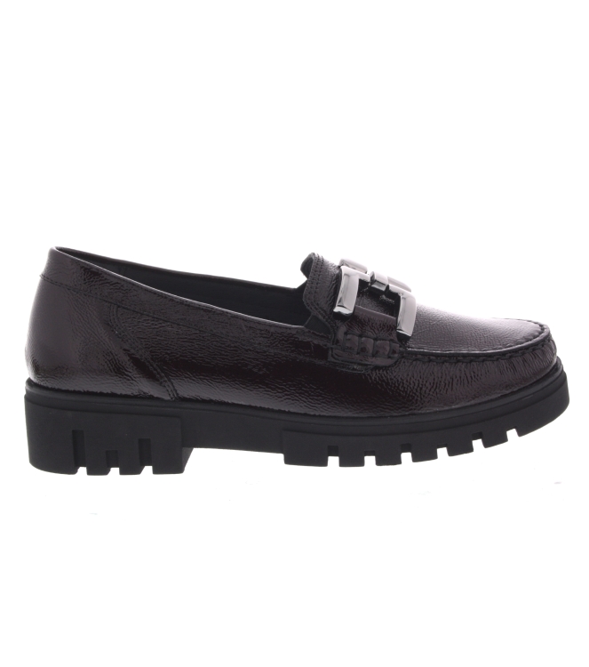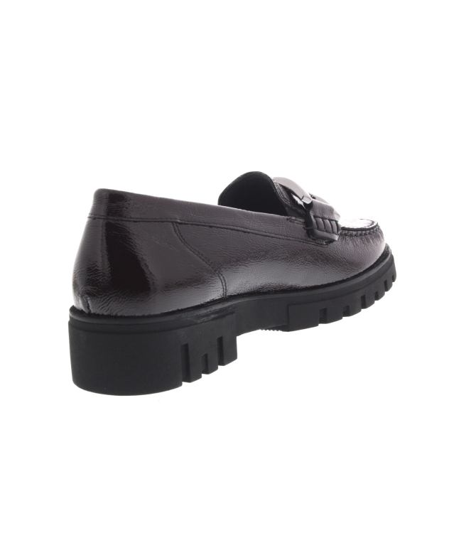 Waldlaufer loafer voor dames, artikel H-Serena 723508 in het bordeaux lakleer. Beschikbaar met uitneembaar voetbed. Pluspunt is het soepele leer en het lichte gewicht van de schoen. De pasvorm valt breed door de H wijdte.