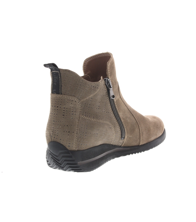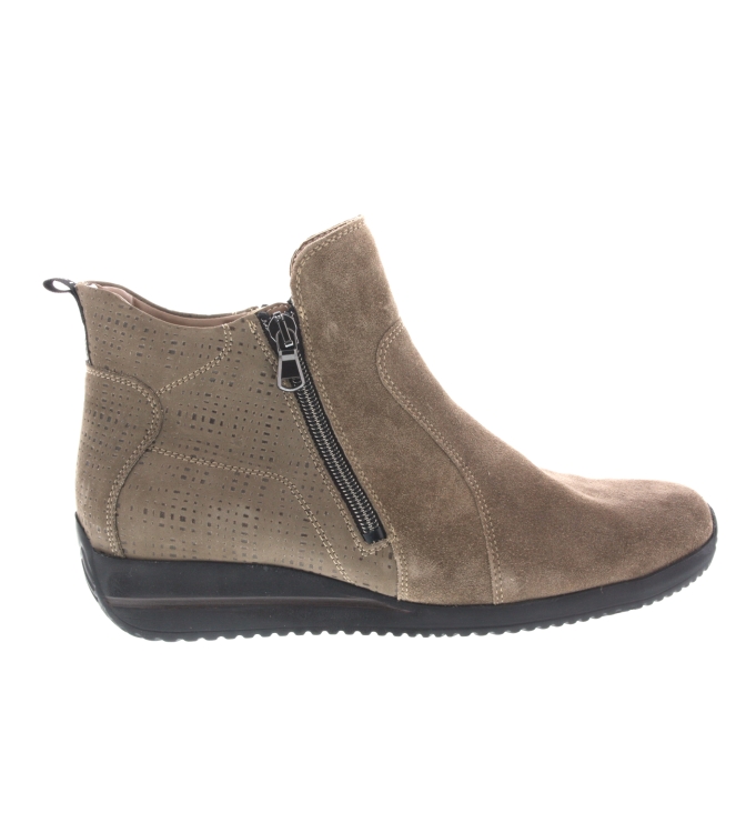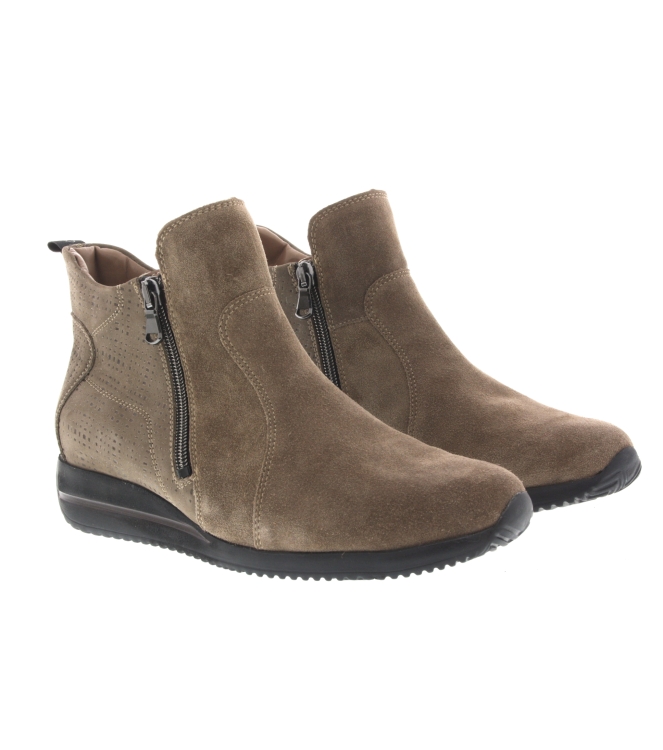 Waldlaufer enkellaars voor dames, artikel Himona 980808 in het taupe nubuck leer. Beschikbaar met 2 functionele ritsen en uitneembaar voetbed. De pasvorm valt breed door de H wijdte.